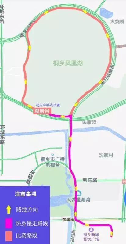由吾悦东广场出发,热身慢走至凤凰湖西南角观景台,之后分组进行绕凤凰湖顺时针一圈跑步比赛,回到观景台即完成比赛。